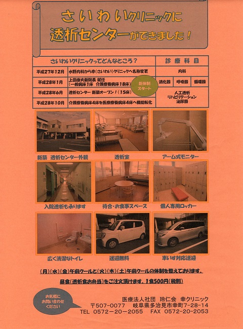 幸クリニックは平成27年12月、以前の水野内科から幸クリニックに名称変更され、平成28年6月に透析センターをオープンした、ベット数は15床 (内オンライン2床)、他に医療療養病床 4床(療養の必要な透析患者も入所が出来ます)と介護療養病床14床、一般病床1床が設備されています。