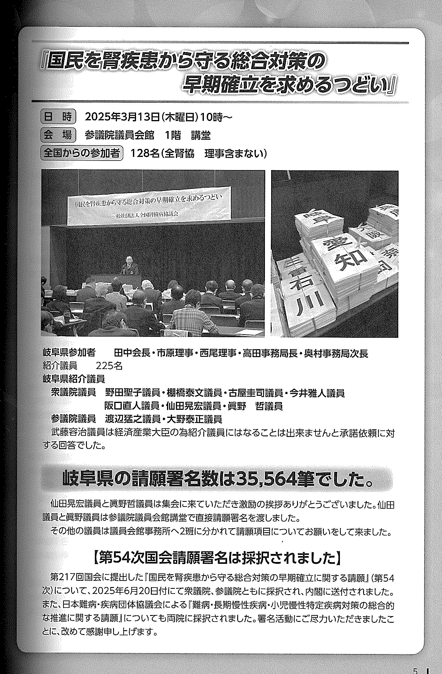 ・第53次国会請願行動で請願署名を届ける ・IPS細胞による腎臓再生医療の現状と将来